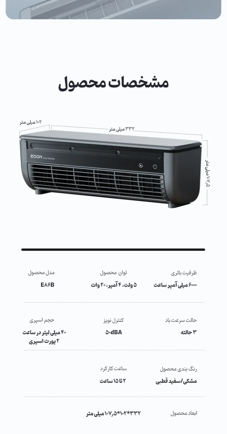 نام محصول: مینی اسپلیت شارژی ترموالکتریک مدل Edon با باتری 6000mAh.